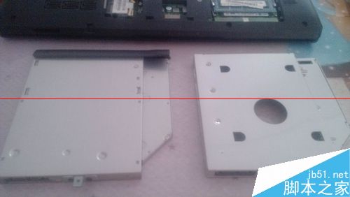 6、左圖是拆下來的光驅,右圖是我們買的,可以看到拆下來的光驅架前端有個用兩個螺絲固定的突出點,我們要拆下來裝到我們購買的支架上,而拆下來的光驅架后端的外部的蓋子,我們也同樣可以拆下來裝到我們購買的支架上(美觀一下)