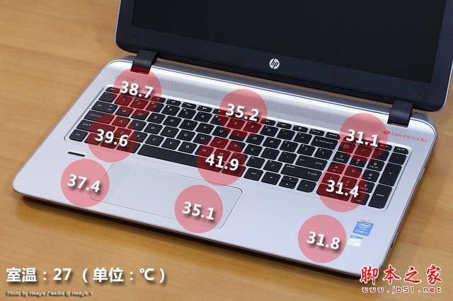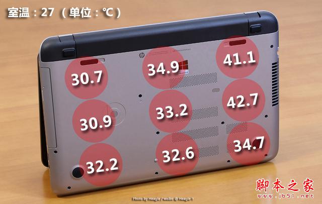 最后,筆者將測試中采集的數據整理成更加直觀的圖片。通過實測可見,小蒼本在滿載狀態下的溫度主要集中在鍵盤中央以及靠近出風口的位置,而其它測量點的溫度都要低于人體體溫,因此即使在極端的使用環境下也不會對使用體驗帶來不好的影響。