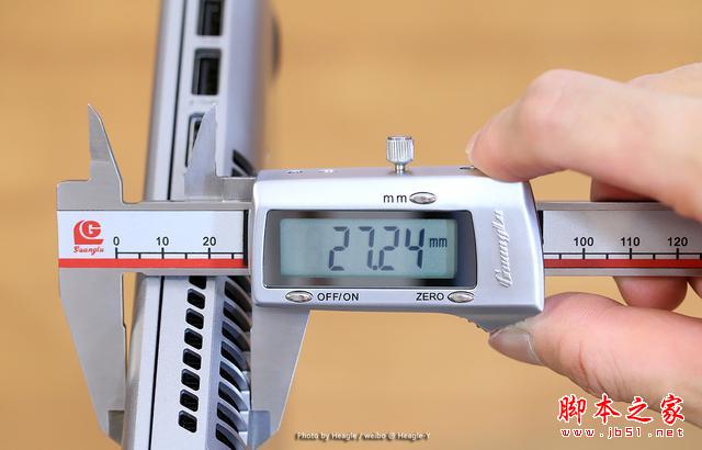 由于機身邊緣采用了圓弧的設計,因此在視覺上營造出更薄的效果,而通過實測機身最厚處也不過 27.24mm 而已。