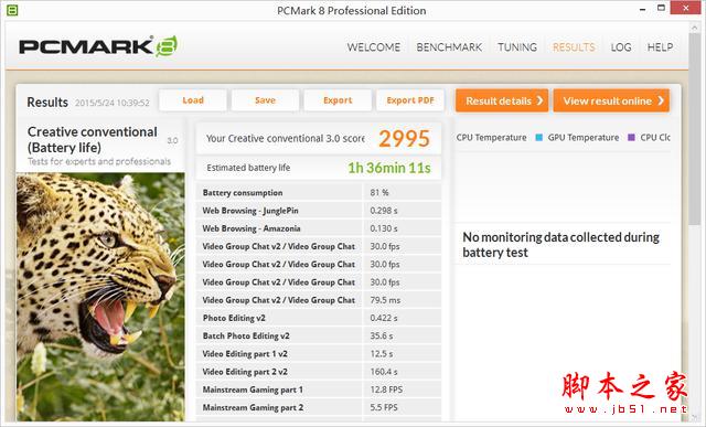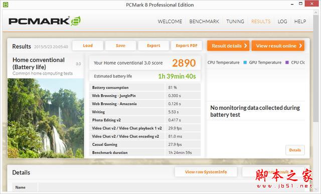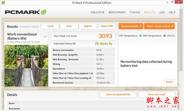 整機性能測試選用了PCMark 8 模擬日常使用電腦的實際情況進行客觀廣泛的測試。PCMark 8 內置了多個測試項目,更加細致的分項測試更具針對性。其中 Home 測試項目主要模擬用戶日常使用電腦的情況,如文本、瀏覽網頁等。而 Creative 測試項目則加入了更多的娛樂應用模擬,例如游戲、視頻播放等等,對性能的“壓榨”相比 Home 測試項目要更高一些。而最后的 Work 測試項目則主要模擬用戶日常使用電腦辦公的情況,對于性能的“壓榨”也要低很多。同時,筆者還利用PCMark 8 的電池續航測試功能分別測試小蒼本在各種測試環境下的電池續航能力,其中電池續航測試是在高性能模式,打開WiFi及鍵盤背光,顯示器亮度設置在 60% 的環境下進行,特此說明。