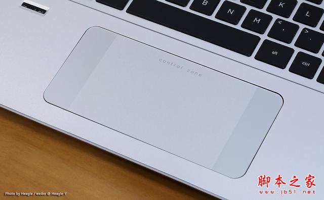 長方形的觸控板設計也是小蒼本的特色之一,觸摸板表面使用不同的觸感劃分成三個區域以提高盲操作的準確性。其中中間區域是傳統的觸控板,表面手感細膩,而觸控板兩側區域表面有明顯的顆粒感,左側區域可選擇打開的應用,而右側區域可以直接調出 Win8 的超級按鈕,類似 Win8 平板的觸控操作方式為 Win8 系統的操作提供了更好的體驗。不過比較遺憾的是,機器并未為觸控板設置快捷鍵開關,要停用觸控板必須到驅動里面設置。
