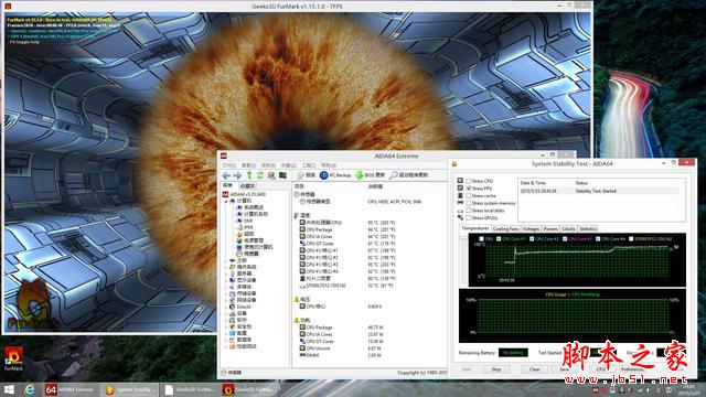 最后使用FurMark進行雙拷測試,由于此時 CPU 溫度到達臨界點出現降頻的情況,因此雙拷狀態下的功耗反而低于游戲狀態。