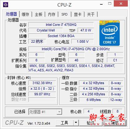 小蒼本所使用的 Intel Core i7-4750HQ 處理器默認頻率 2.0G,最高睿頻 3.2G,四核八線程設計,采用 22nm 工藝制作,熱設計功耗(TDP)47W,該處理器最大的亮點是整合了 Intel 目前性能最強悍的 Iris Pro Graphics 5200 顯示核芯,這個在下面會詳細測試,這里先簡單帶過。