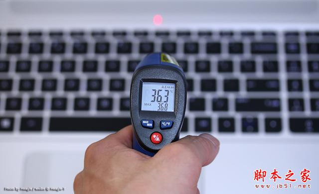 如果說 CPU 的核心溫度數據對于大家來說太抽象,那么下面的筆記本表面溫度測試則關乎到使用者的使用舒適度,因此相比 CPU 核心溫度更加有意義,下面筆者將使用紅外線測溫槍對正在進行壓力測試(滿載)的小蒼本進行表面溫度測試。