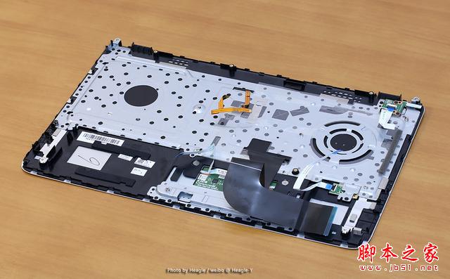 分離CD殼并拆開相連的排線后即可將C殼完全取出。通過下面這張圖可以清楚看到小蒼本的內部,左右雙揚聲器加上大腔體低音炮的設計是小蒼本Beats Audio 音效的基礎。光驅與硬盤采用軟排線與主板相連,同樣,右側的指示燈、復合音頻接口以及 USB 3.0 接口也是通過軟排線連接到主板上。