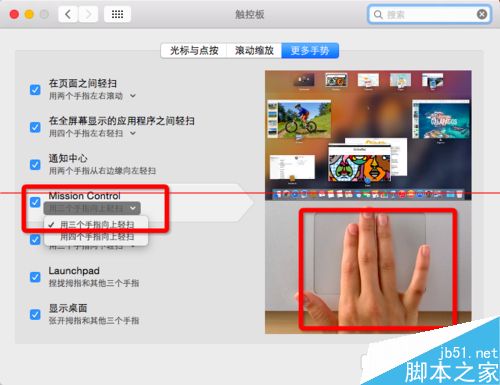 切換應用方法三:進入“系統偏好設置”-“觸控板”-“更多手勢”,選擇“mission control”-“用三個手指向上輕掃”,用三個手指向上輕掃操作觸控板,確認所選擇應用即可。用三個手指向下輕掃可返回當前。