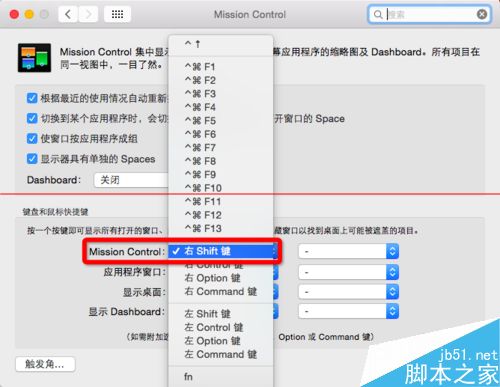 如果覺得control+向上鍵操作不便,可進入“系統偏好設置”-“mission control”-“mission control”,修改為“右shift鍵”,會更加方便操作。