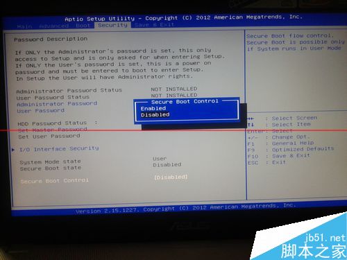 2、進入BIOS后按方向鍵選擇【Secureity】選項卡,通過方向鍵選擇【Secure Boot Control】選項,將其設定為 “Disabled” 關閉安全啟動控制 按F10 保存設置,重啟系統。