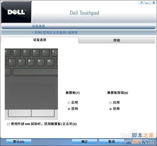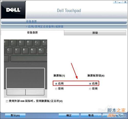 然后在該窗口下,我們點擊最左上角的"設(shè)備選擇",然后就會切換至另外一個窗口下,我們可以看到其中有觸摸板和觸摸板按鈕兩個選項,我們將這兩項由禁用改為啟用就可以了,如圖