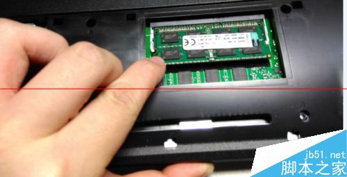 7、輕輕壓下內存條,當聽到“叮”的一聲,表示卡槽已經卡好了內存條。此時內存已經正確插入電腦