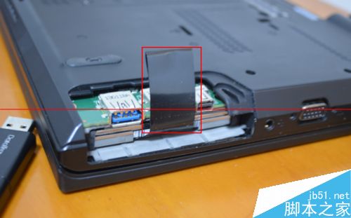 5、下圖圈住的黑色拉帶,默認放在硬盤的上下縫隙里,將其取出,拉出硬盤即可。
