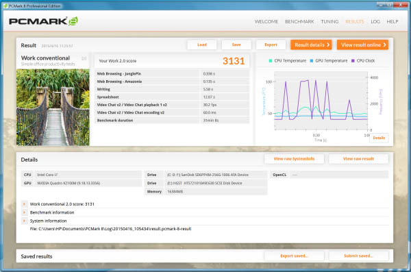 PCMark 8是針對Windows系統的整機性能基準測試軟件,采用了分項測試的方式,這一點和之前的有所不同——之前版本的PCMark雖然也同樣具備了不同的分項,但都需要使用者在設置項目中進行調試,而PCMark 8則直接將各個項目進行了分類,我們在進行測試之前就必須選擇其中一項,這幾個項目分別是Home、Creative、Work、Storge和Applications。其中的Storge主要測試的是電腦的存儲效能和穩定性,而Applications則主要針對微軟Office等第三方軟件所進行的測試。前三項測試中有電池測試模式可選,用戶可根據實際需要選擇合適的模式進行測試。我們在Work模式下,對設備的辦公性能進行測試。3131的成績,證明這款筆記本對商務人士的日常工作需求都能輕松滿足。