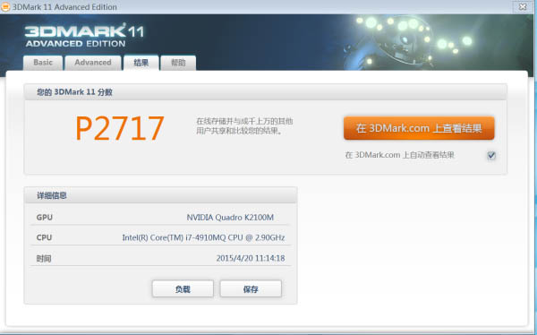 Futuremark公司的3DMark軟件一直以來都是權威的游戲性能測試軟件,新版3DMark通吃Windows、Windows RT、iOS、Android四大操作系統,橫跨桌面和移動設備,不同平臺上的成績也是可以直接對比的。并由Ice Storm、Cloud Gate和Fire Strike三個測試組成,分別適用于“移動設備和入門級電腦”、“筆記本電腦和家用電腦”以及“高性能游戲電腦”。而3DMark 11軟件使用原生DirectX 11引擎,在測試場景中應用了包括Tessellation曲面細分、Compute Shader以及多線程在內的大量DX11新特性。最終,3Dark 11得分P2717分,顯卡性能表現良好,足以滿足日常的娛樂需要。