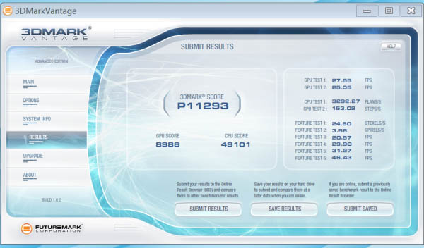 3DMark Vantage是業界第一套專門基于微軟DirectX 10 API打造的綜合性基準測試工具,并能全面發揮多路顯卡、多核心處理的優勢,滿足PC系統游戲性能測試需求。 通過實際測試后,在Entry模式下最終獲得P11293分,其中CPU得分為49101,GPU得分為8986。