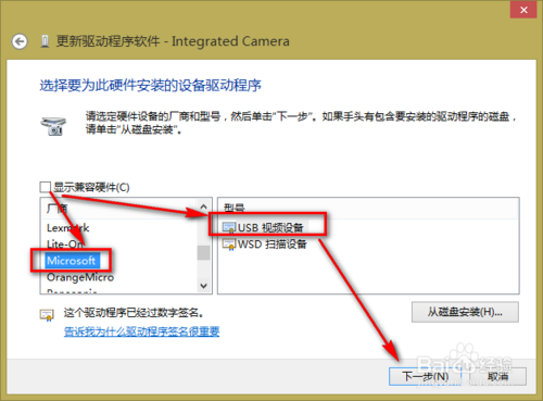 4、取消“顯示兼容硬件”的勾選項,在“廠商”中選擇“Microsoft”,在“型號”中選擇“USB視頻設備”,點擊下一步