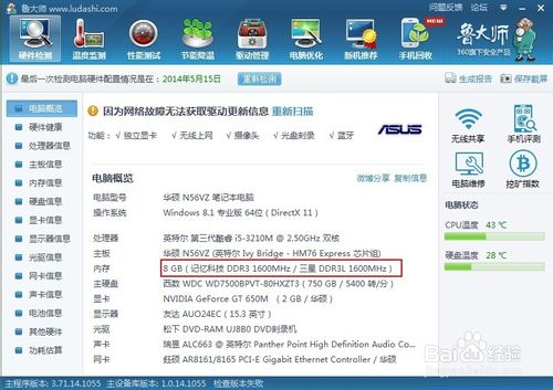 1、用魯大師檢測(cè)一下自己原先的內(nèi)存配置。
