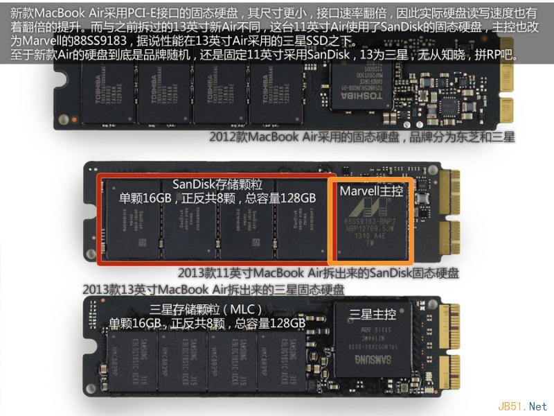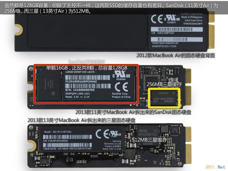 新Air的固態(tài)硬盤有兩個品牌,主控不一樣,緩存容量也不一樣,其中SanDisk為256MB。
