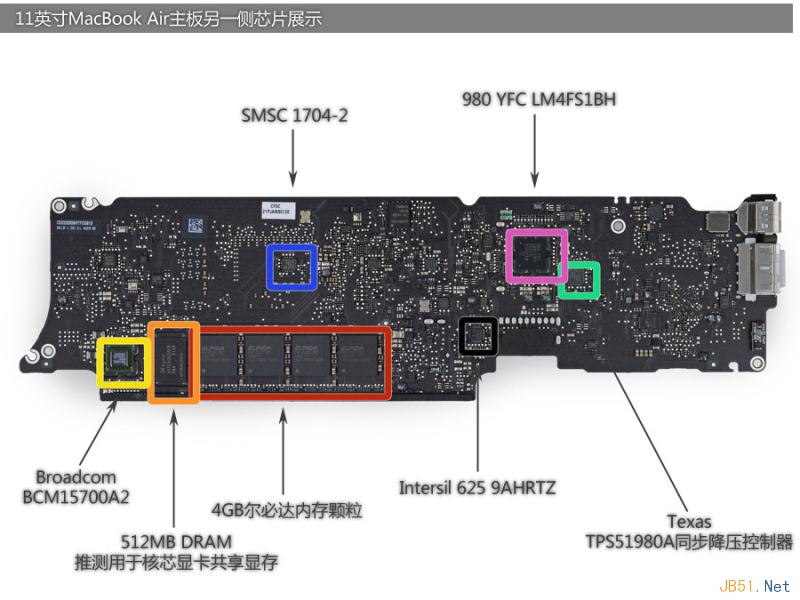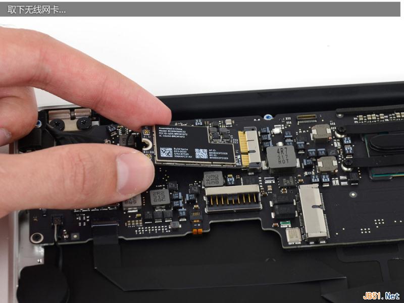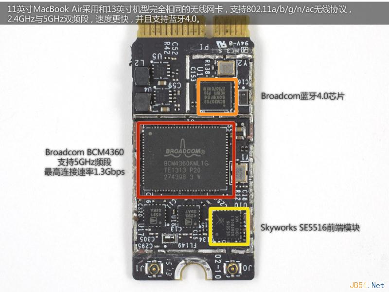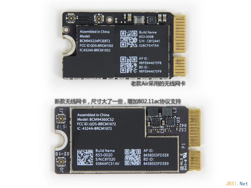 新款MacBook Air采用的無線網(wǎng)卡尺寸比老款大了一些,并增加了802.11ac無線協(xié)議支持,帶金屬屏蔽罩。
