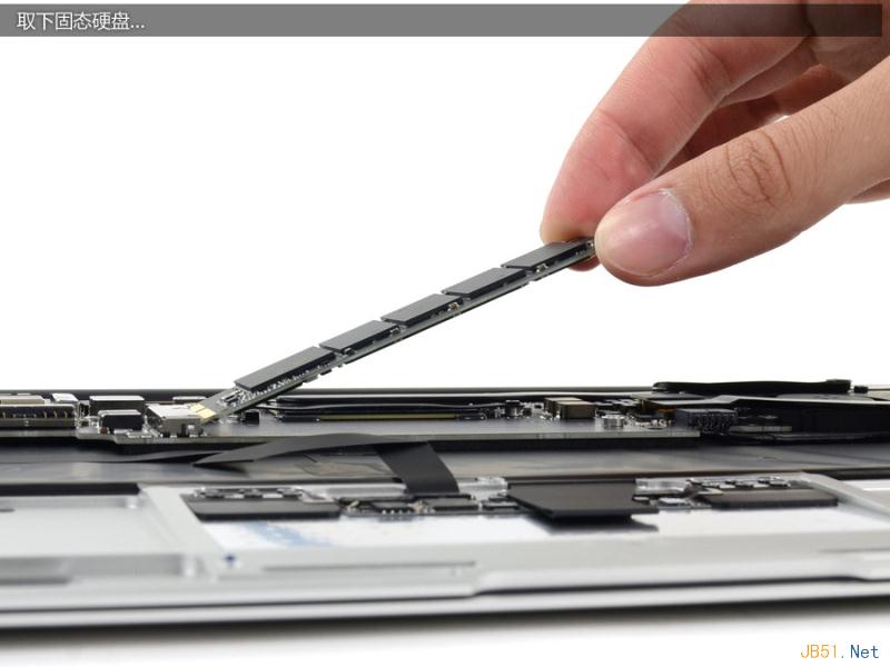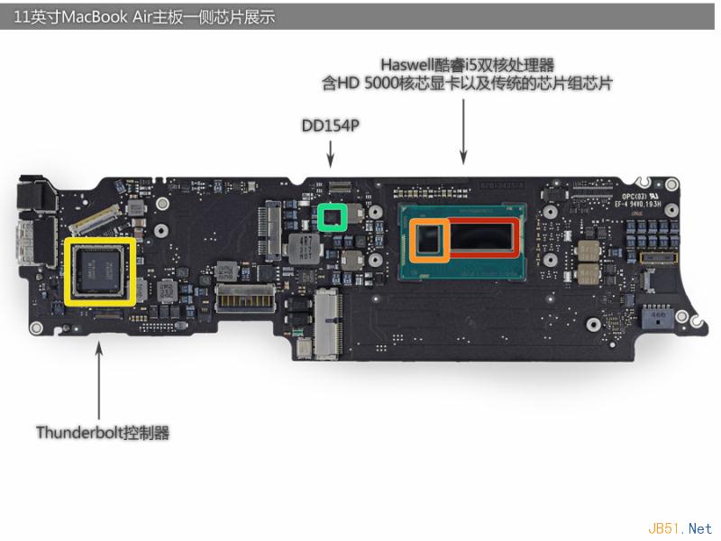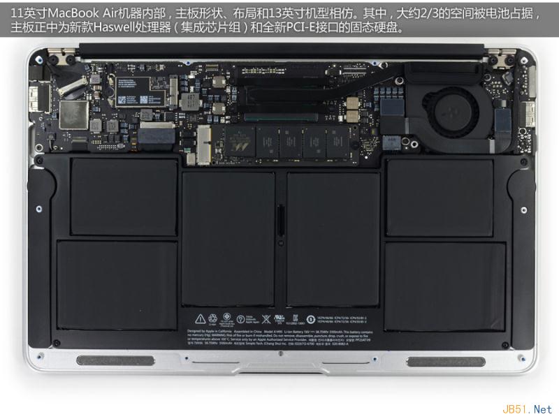11英寸MacBook Air的機器內部,主板形狀、布局和13英寸機型相仿。其中,大概2/3的空間被電池占據(jù),主板正中為Haswell處理器和全新PCI-E接口的固態(tài)硬盤。