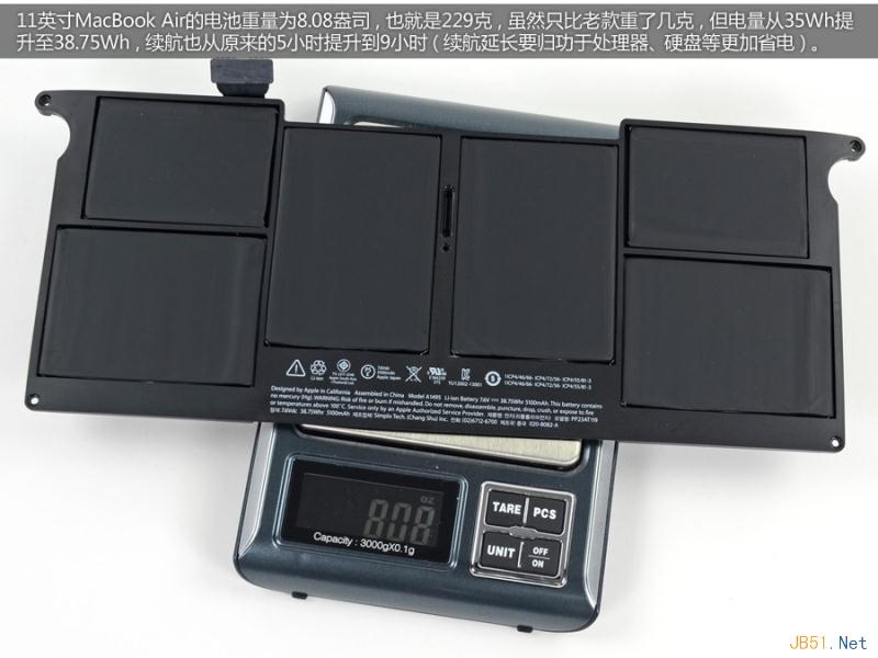 11英寸MacBook Air的電池重量為8.08盎司,也就是229克,比老款重了幾克,續(xù)航方面由原來的5小時提升至9小時,幾乎翻倍。