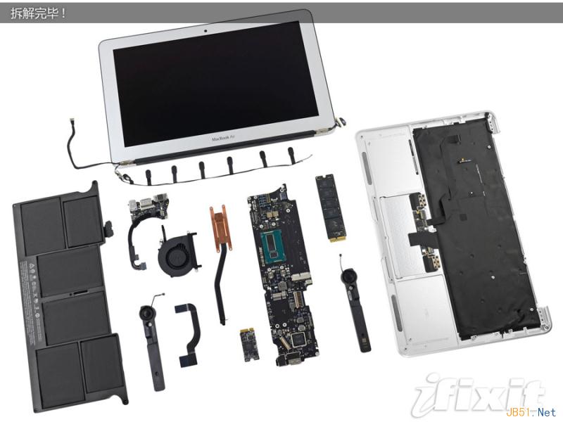 至此這臺2013款11英寸MacBook Air拆解完畢。該機主板集成度很高,布局工整,沒有太多零零散散的排線,看似簡單,但又非常精密,黑色主板也顯得很上檔次!其升級空間很有限,處理器、內存均不可升級,硬盤目前也不容易找到替代品,因此在購買之時就必須為未來做好打算,購買配置較高的版本。謝謝您的觀看。