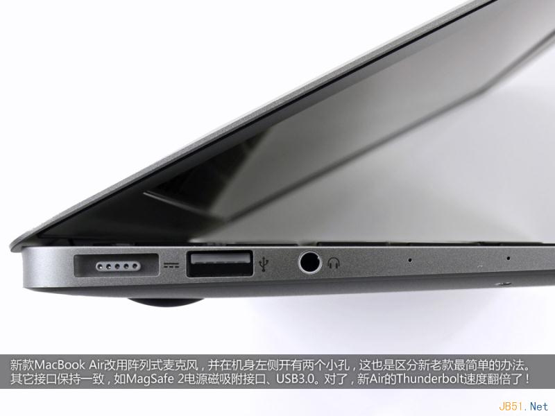 新款MacBook Air改用陣列式麥克風,并在機身左側開有兩個小孔,這也是區(qū)分新老款最簡單的辦法。接口方面則基本保持一致,如MagSafe2電源磁吸附接口、USB3.0。對了,新Air的Thunderbolt速度翻倍了!
