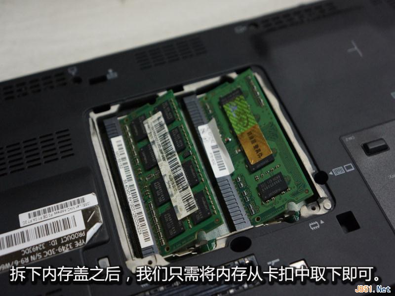 拆下內(nèi)存蓋后,我們只要把兩邊的卡扣松動(dòng),輕輕一拔即可把內(nèi)存取下。