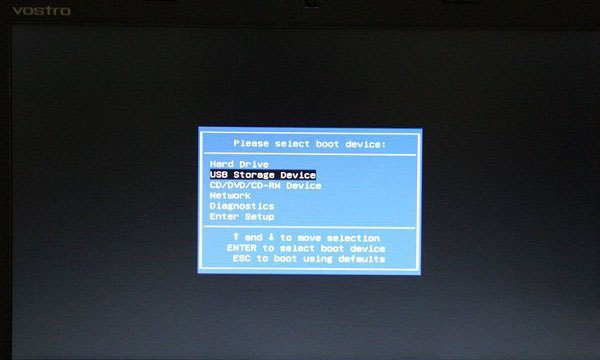 同樣是在電腦重啟或者開機進入標志界面的時候,我們立即按鍵盤上的F12鍵,之后將進入如下快捷啟動項設置界面,這里我們直接選擇第二項“USB Storage Device(有些直接顯示插入筆記本的U盤名稱,總是是含有USB字樣的這項)”,選中后,我們直接按Enter(回車鍵),之后即可進入U盤啟動界面了。
