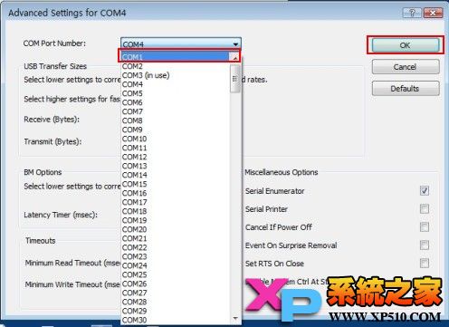 5、單擊“COM Port Number”右側的下拉箭頭,選擇所需要的端口號,如COM1,單擊“OK”。如圖:
