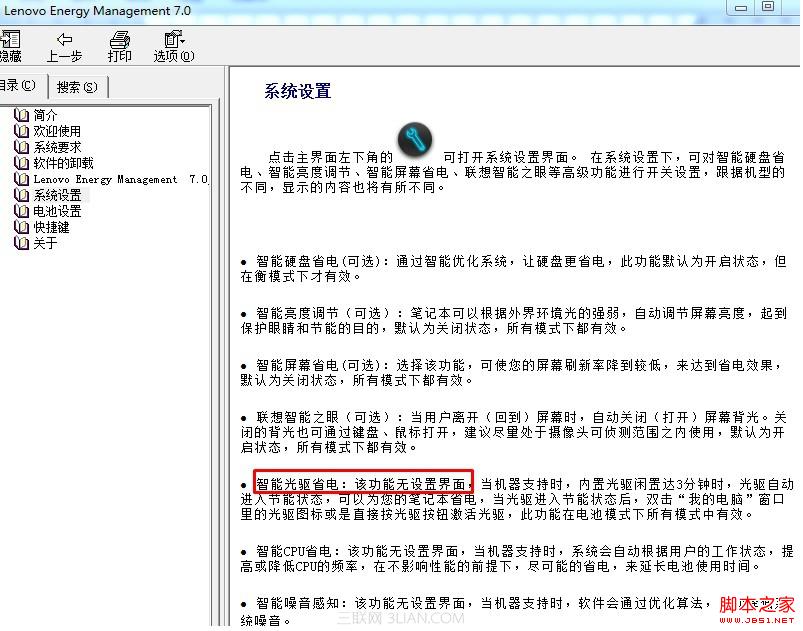 如果取消此節電功能,能否做到?如何處理?此功能在電源管理軟件中可以關閉,取消下圖中的紅圈中的勾就可以。但是,在現有7、8系列筆記本電腦標配的6.0、7.0兩個版本電源管理軟件的各個小版本的操作界面中,均未找到相關操作界面。繼續查找電源管理軟件7.0的幫助文件,在“系統設置”中有如下說明:“智能光驅省電:該功能無設置界面,當機器支持時,內置光驅閑置達3分鐘時,光驅自動進入節能狀態,可以為您的筆記本省電,當光驅進入節能狀態后,雙擊“我的電腦”窗口里的光驅圖標或是直接按光驅按鈕激活光驅,此功能在電池模式下所有模式中有效。”如圖:
