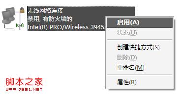 ⒉進入到網絡連接窗口,找到無線網絡連接,單擊鼠標右鍵,選擇“啟用”