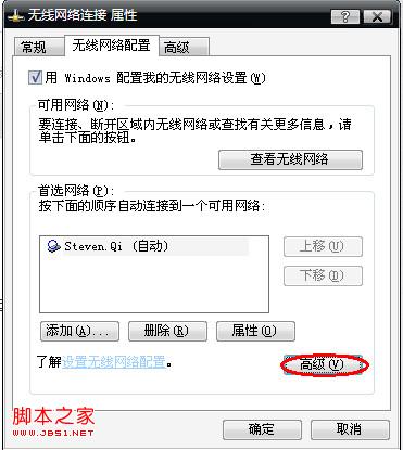 ⒎如圖你可以看到你剛才設置的那個無線網絡了,并點擊“高級”選項