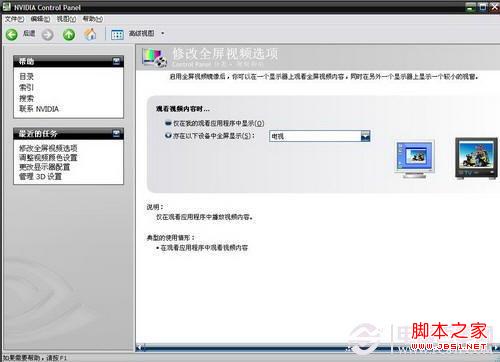 第四步:點(diǎn)擊進(jìn)入“視頻和電視→修改全屏視頻選項(xiàng)”設(shè)置界面,在“觀看視頻內(nèi)容時(shí)”處勾選“亦在以下設(shè)備中全屏顯示”,并在旁邊的下拉列表中選擇“電(如圖二)