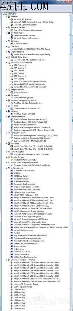 系統(tǒng)安裝的過程略過,安裝完之后,Windows 7會有5個未知設(shè)備,而根據(jù)安裝的設(shè)備和設(shè)置不同,未知設(shè)備的數(shù)量也會有所差別,比如有人安裝了 42T0961(UNDP-1雙模WWAN卡,因此9個未知設(shè)備,如下圖,除了Qualcomm HS-USB四個之外,一般的T400s都是有其它的 5個未知設(shè)備: