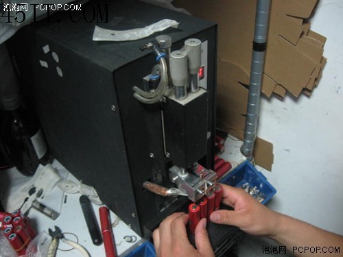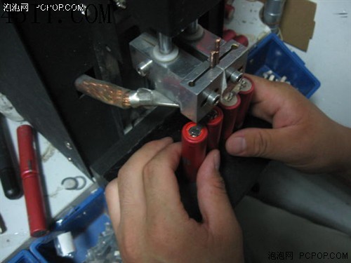然后,我們會使用點焊機和鎳片,將電芯組合到一起。