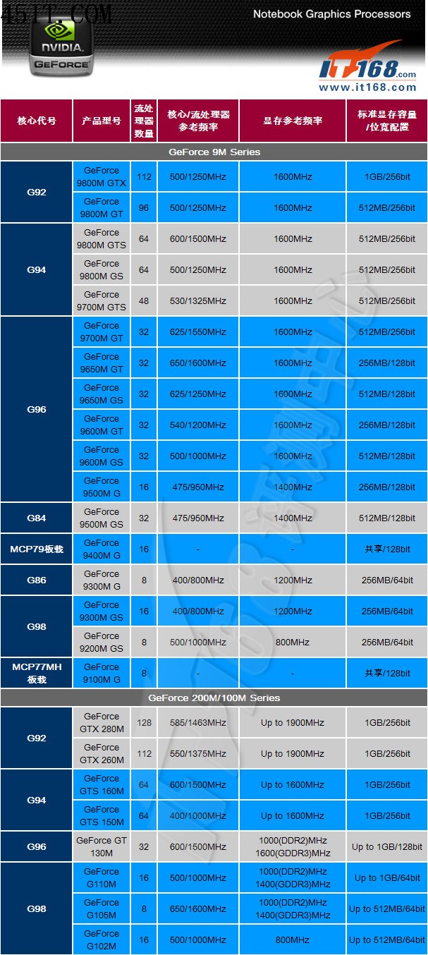 就以GeForce 9600M系列為例,該系列一共有4個型號的產品,型號命名與核心規格并沒有清晰的命名規則。實際上,整個GeForce 9600M系列的產品都是基于G96的圖形核心,也就是等于桌面平臺的GeForce 9500GT而不是GeForce 9600,性能存在相當大的差距。而其他系列的型號也同樣如此,一般的消費者甚至對DIY略懂的玩家都不能通過產品型號大概判斷出產品的性能表現,從而影響到用戶不能準確地選擇自己實際需要的產品規格。