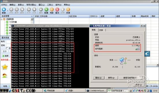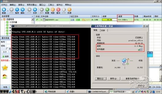 現(xiàn)在我們把那臺信號表現(xiàn)最差的筆記本A無線網(wǎng)卡配置進行了調(diào)整,調(diào)整后的筆記本A表現(xiàn)不凡。同樣是在測試點3,同樣是下載那個QQ軟件,迅雷下載的最高峰值達到了310KB/s,平均值也在250KB/s左右。而且信號平穩(wěn),PING無線路由也沒有掉包的情況。