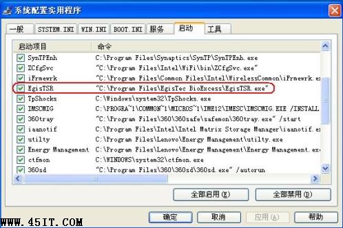 通過“開始-運行-msconfig”打開系統配置實用程序,勾選“EgisTSR”復選框,重新啟動計算機即可。