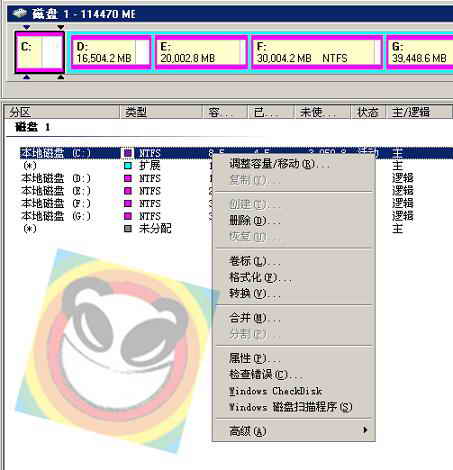 這是在你龐大的C盤上點右鍵選擇調整容量/移動。最好給C盤留下20G-15G的空間!