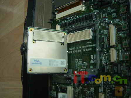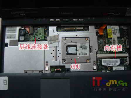 拆開鍵盤后我們可以看到右下方有一個空的內存插槽,目前我們所見到的內存槽大多都是在筆記本背面。在筆記本另一邊大家是否看到了屏線的連接位置和一般的屏有所不同,大多數筆記本的屏線連接處都是接到主板上的,但這款筆記本卻是在原主板上另增加一塊線路板,線路板上集成了顯示轉換芯片(顯卡輸出電壓致使這芯片輸出4組同步信號上液晶屏起顯示顏色作用)我們每天都要翻合液晶屏,時間久了這電路板會不會因為震動的問題而松動呢?或這點就是設計上的不足吧!不過任何東西都不會有十全十美的。