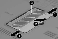 展開內存模塊插座兩側的固定夾 1 以松開內存模塊板。 (將該板的右側從筆記本電腦中抬起。) 以角度 2 將內存模塊拔出插座。 取下內存模塊板。 注意內存模塊有凹槽 3,用以防止將其錯誤地安裝到內存模塊插座中。