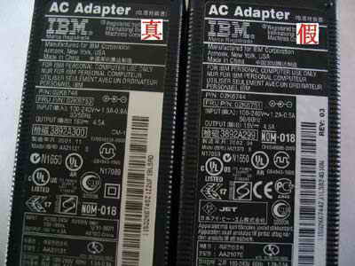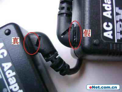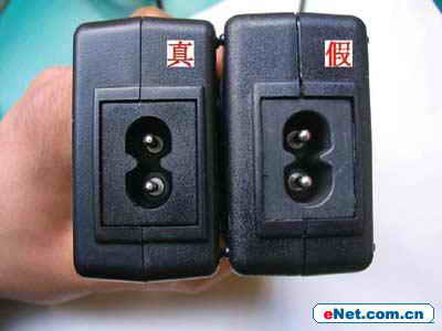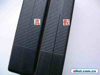 其它部位。真品在直流電輸出線與適配器相連接處很緊密且非常光潔,而假貨有明顯的空隙,還有一些橡膠毛刺。