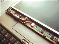 雖然故障初步判斷出來了,但還得經(jīng)過實踐確認。看來還得對心愛的本本動刀子了。首先要把電源拔掉,電池取下來。然后打后液晶屏把它扳到水平位置,四個角上的皮墊下有螺絲把它卸掉。