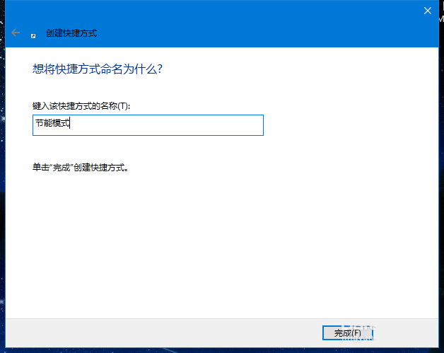 3、名稱根據(jù)需要填寫,如節(jié)能模式,完成,桌面即出現(xiàn)一個快捷方式,右鍵該快捷方式,選擇屬性,進入屬性頁