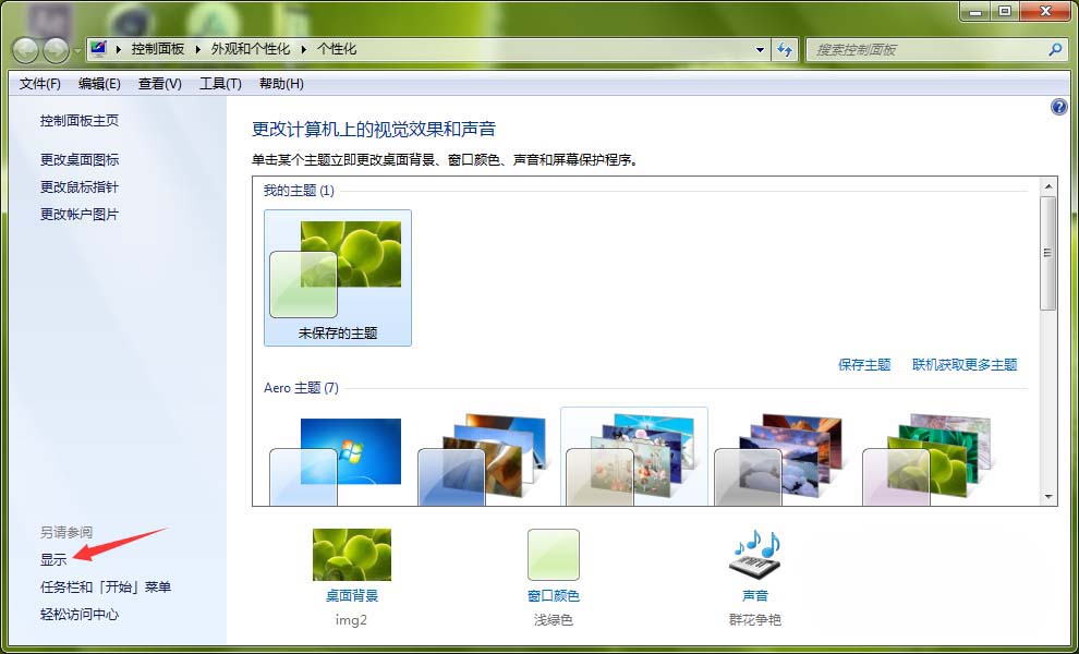 2、在打開的個性化設置窗口中,點擊窗口左側的【顯示】