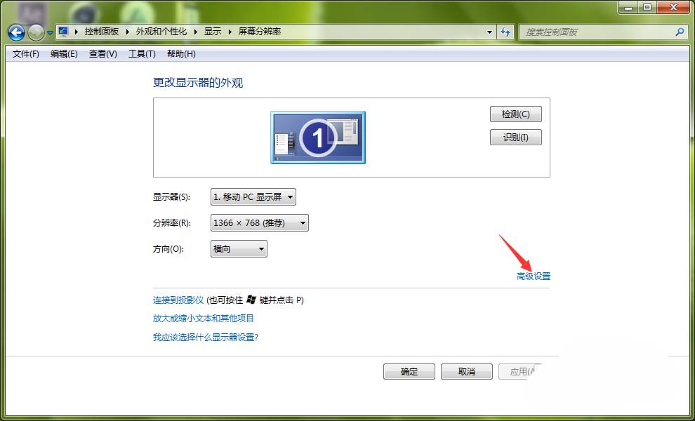 4、在打開的顯示器設置窗口中,點擊箭頭所指的【高級設置】