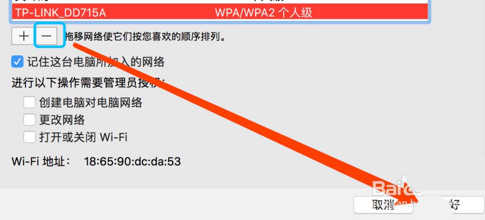 4、選擇其中的一個無線網絡,【-】減號刪除,選擇【好】。這樣就將不需要的網絡刪除忘記掉了。
