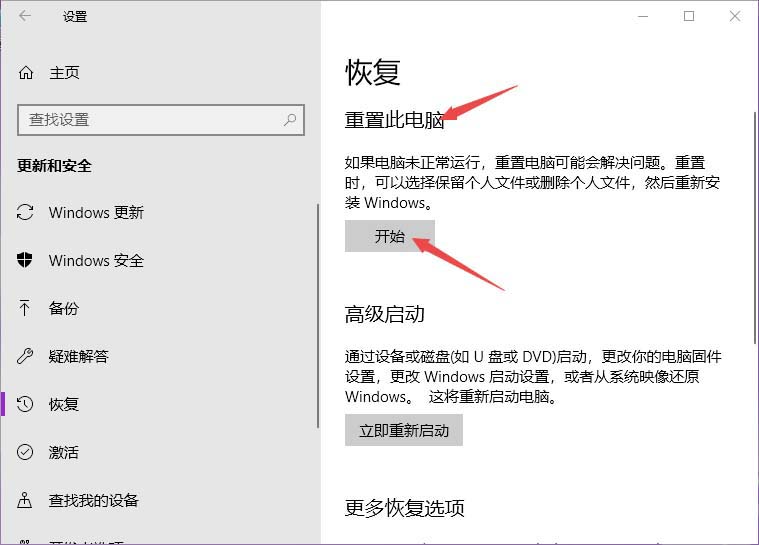 5、然后我們就可以看到重置此電腦了,我們點擊重置此電腦下方的開始按鈕;