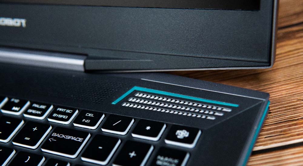 鍵盤上方左右各有一個類似音響的位置,但其實這并不是發聲單元,而是兩個出風口,雷神911PRO鈦空版是一款六出風口的游戲本,這應該也是前所未有的設計。