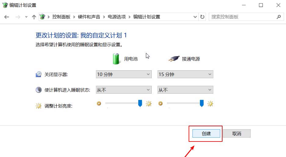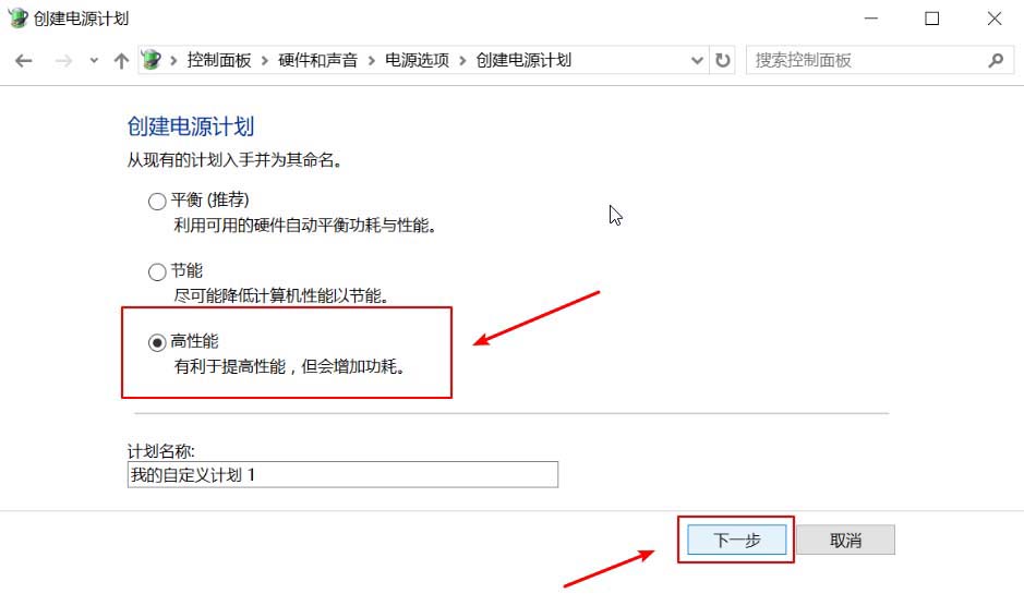 8、創建電源計劃——選擇“高性能”———下一步———創建(7590,G3..有的機子沒有高性能的選項直接右下角🔋圖標,然后拉到最右邊的最佳性能,看第8步的圖4)